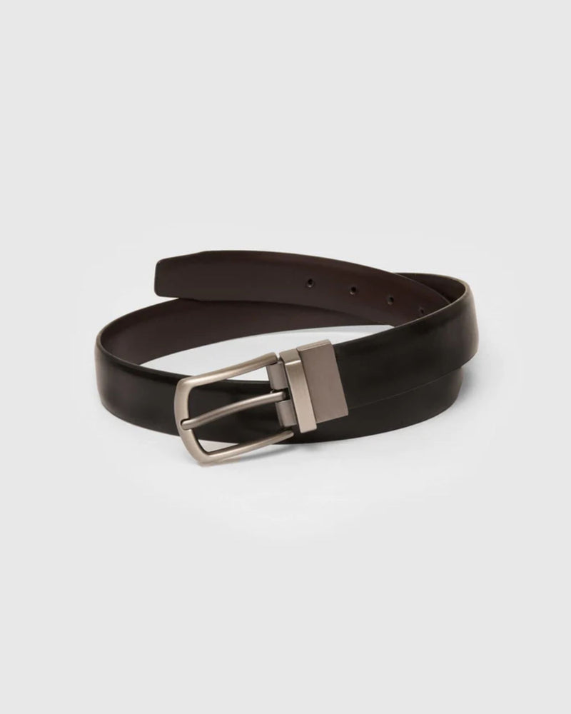Reversible 2-in-1 black/brown belt that dresses up to smartly complement any look. Made with faux leather to heighten your gentlemanliness.