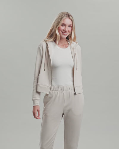 Finally, the hoodie that gets it right — ultra-soft, made for movement, and cropped just enough for a modern, flattering fit. Its zip front and relaxed silhouette make it perfect for layering (but it’s cozy enough to wear on its own).